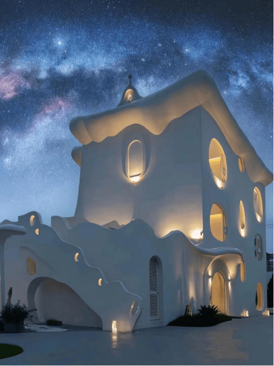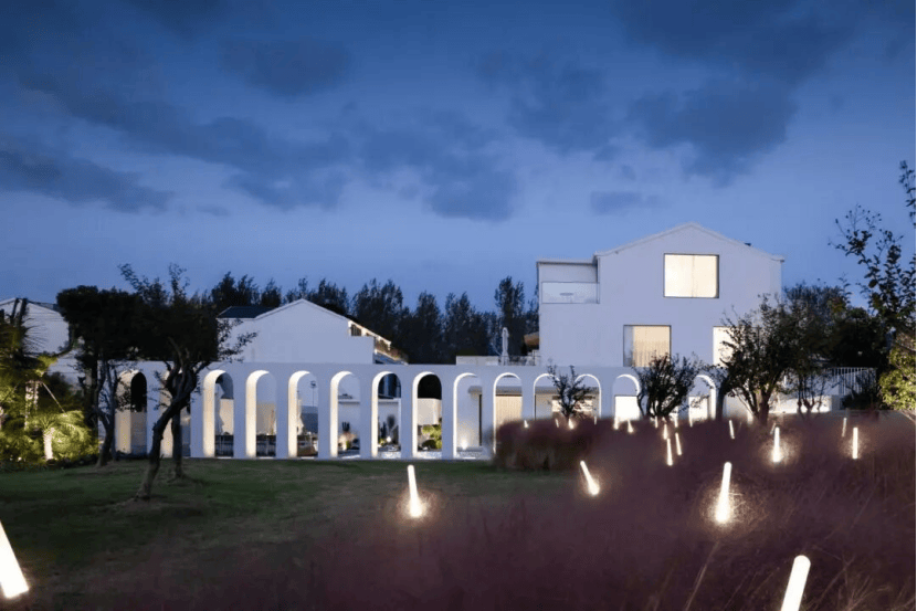 米拉夏朵的设计灵感源自于西班牙建筑大师高迪的米拉公寓。高迪的名言“直线属于人类,曲线属于上帝”,这句话体现在民宿设计时的每一处细节。一栋白色云朵般的城堡外观,在碧蓝天空的映衬下,宛若成为了另一个童话城堡。客房和整体公区设计极具巧思且风格迥异,融入了有机和侘寂风,将西方美学与东方美学巧妙结合。