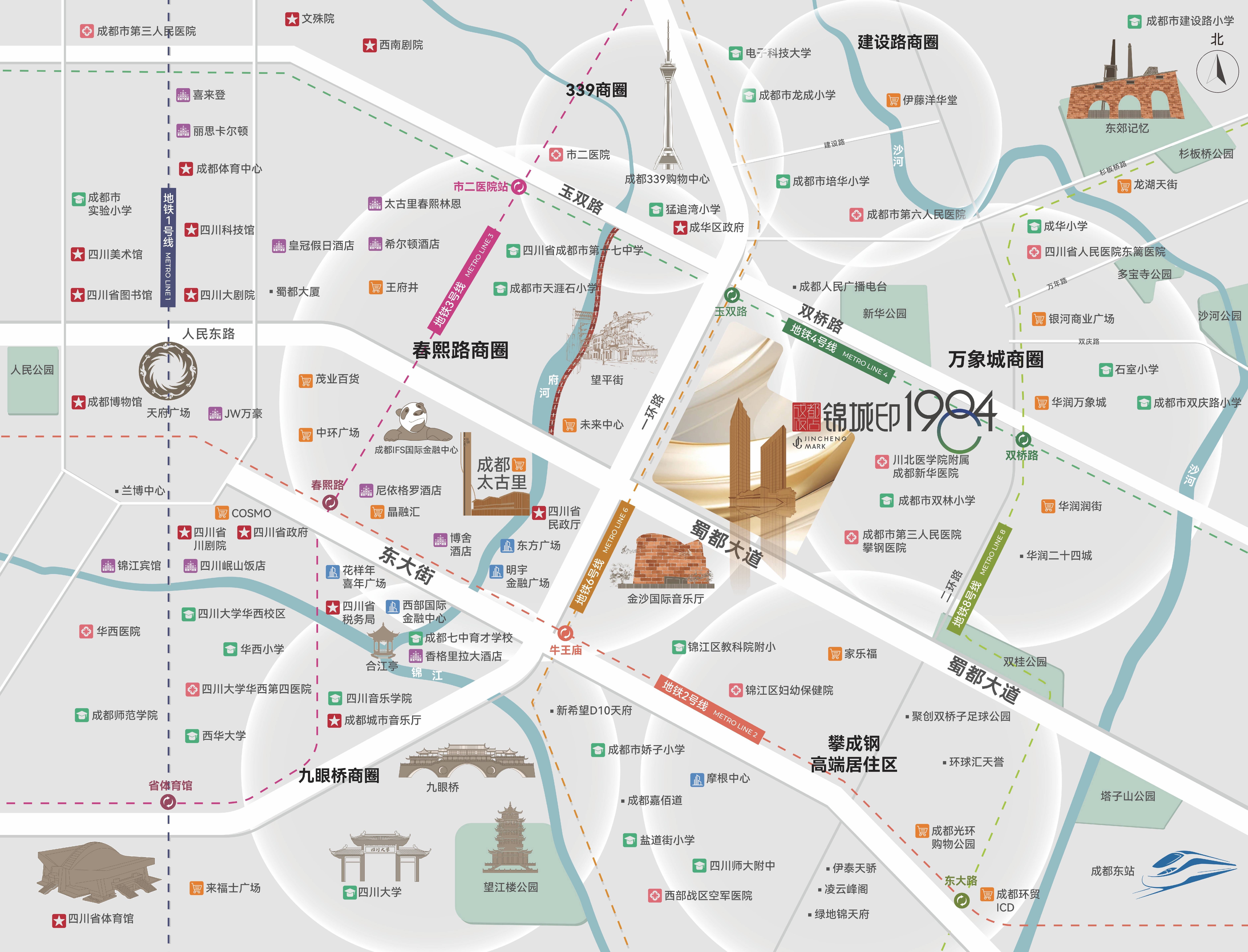 六大商圈:项目周边六大商圈集聚,步行即达全国顶级商圈「春熙路/太古里」,更有「万象城」、「339」、「九眼桥」、「建设路」、「东大街/攀成钢」等六大商圈包围,亿万人流在此汇集!此外,项目周边盒马生鲜、永辉超市等生活类商业配套一应俱全,生活便利舒心!
