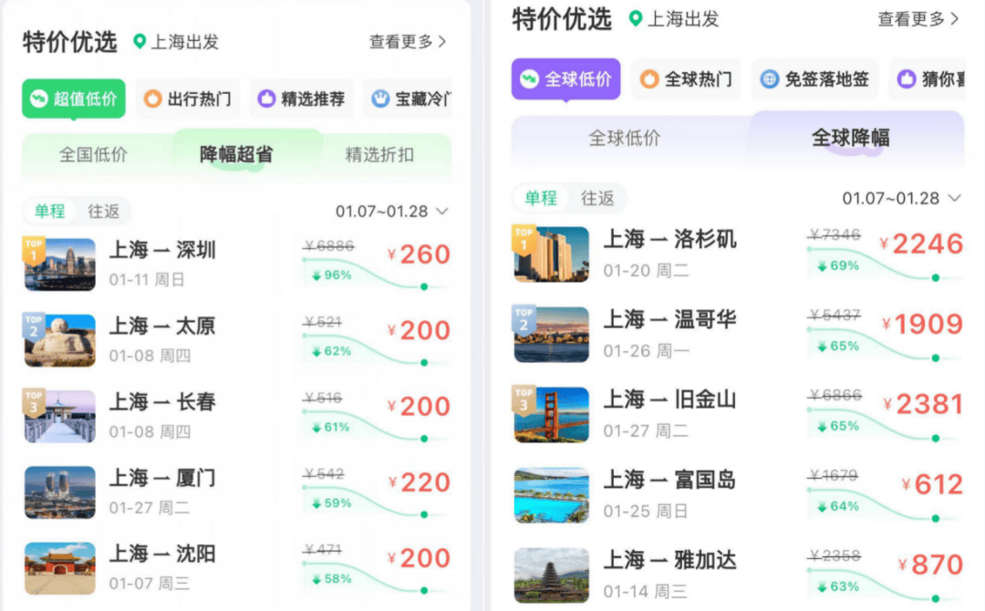 同程旅行APP机票频道内的“特价优选”专区上,1月8日出发的航班中,广州-沈阳、上海-太原、深圳-大连、深圳-长春的部分特价机票“省钱力度”超过60%。相同出发时间里,国际机票均价相比元旦和春节也便宜不少,部分长航线的机票价格“省钱力度”高于短途航线。