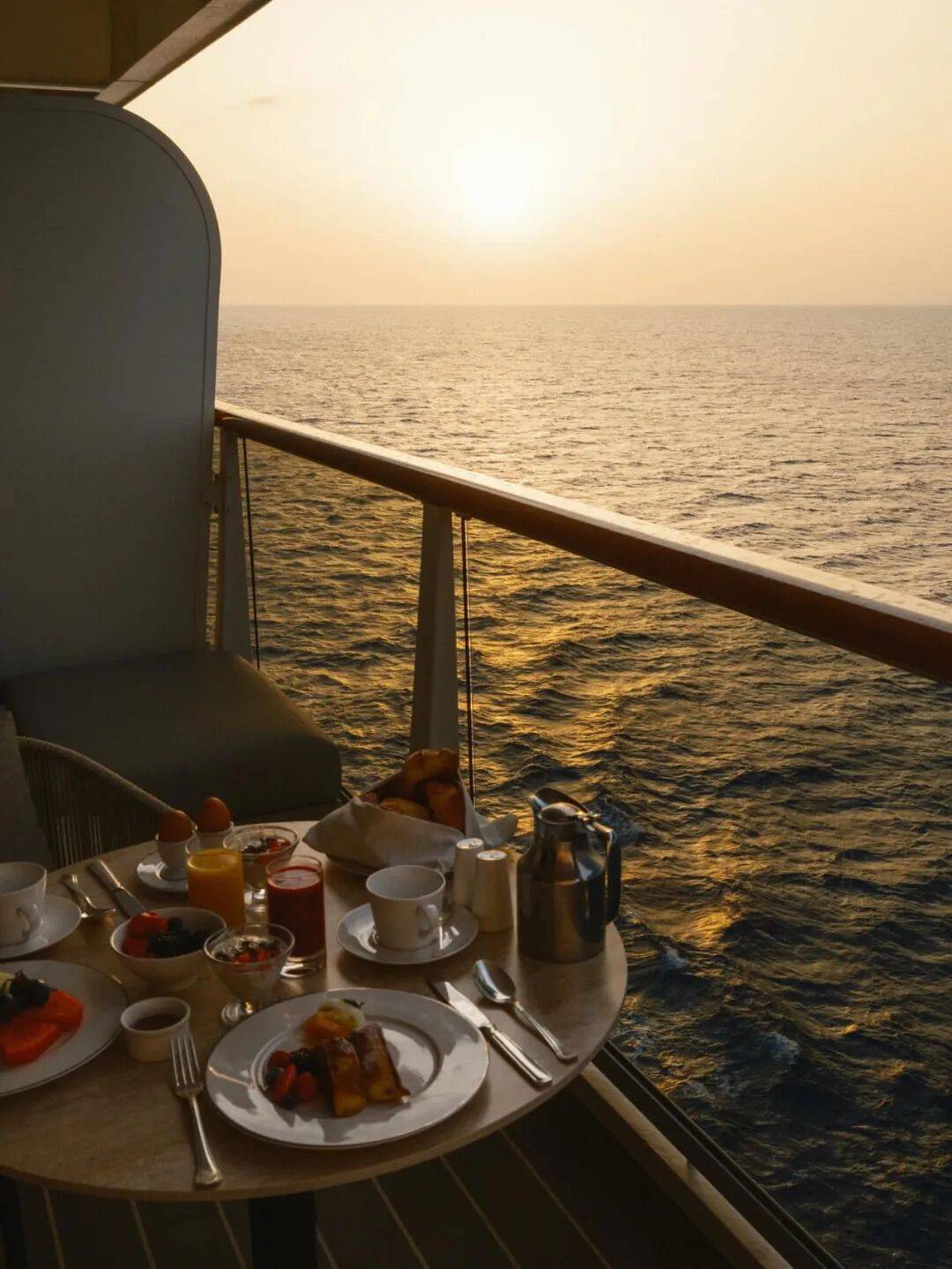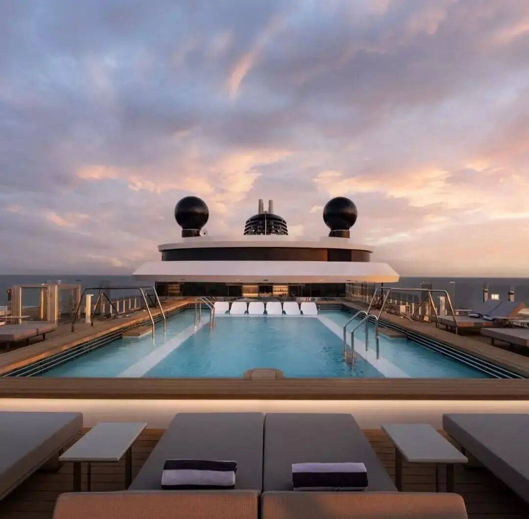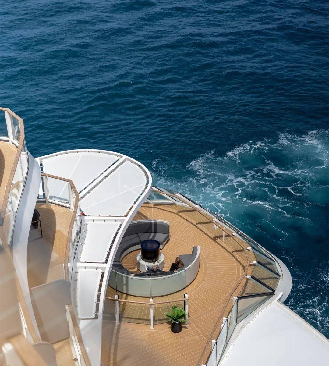 全套房 + 私人阳台:几乎每间套房都带私人柚木阳台,6–9 层安静视野好。基础阳台套房 33㎡,业主套房达 98㎡,悠享套房高达 123㎡,阳台 40㎡,在邮轮中极为罕见。