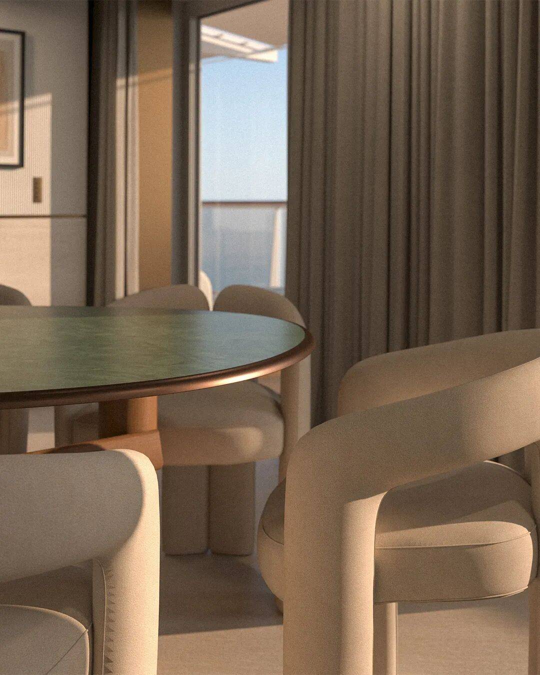 澜水号全长 241 米,仅设 224 间套房,全部带私人露台,在同级别游艇中极为罕见。设计风格明亮温润,以浅木与亚麻为主,像一间间海上度假别墅: