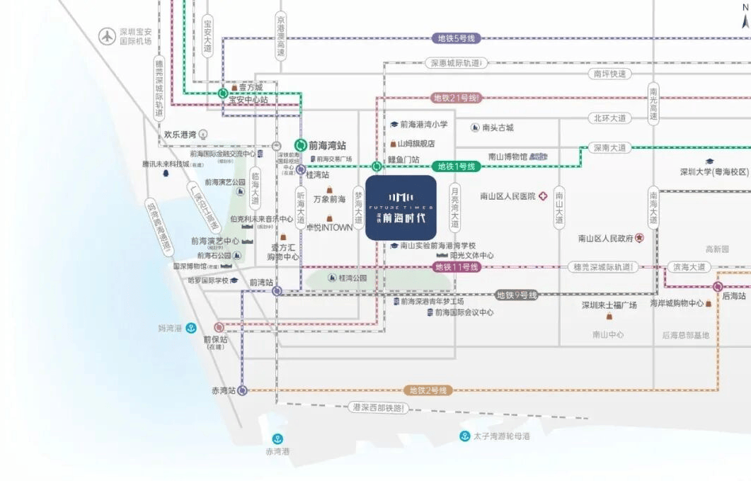 深铁前海时代总部中心邻近地铁1号线鲤鱼门站、毗邻深铁前海国际枢纽中心(在建),海陆空轨多维交通,畅联湾区城际、通达全球主要城市